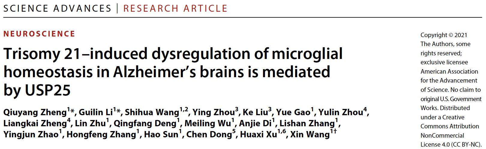近日,王鑫教授团队在Science Advances上发表题为“Trisomy 21-induced Dysregulation of Microglial Homeostasis in Alzheimer’s Brains is Mediated by USP25”的研究成果,该研究揭示了治疗阿尔茨海默病和唐氏综合征新的治疗靶点,并且在小鼠模型上利用USP25小分子抑制剂成功地改善了阿尔茨海默病小鼠的认知功能,缓解了神经退行性病变的病理进程。