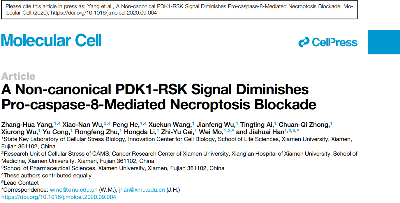 2020年9月25日,细胞应激生物学国家重点实验室,厦门大学生命科学学院韩家淮课题组和莫玮课题组合作在Molecular Cell杂志上发表题为“A Non-canonical PDK1-RSK Signal Diminishes Pro-Caspase-8-Mediated Necroptosis Blockade”的研究文章,报道了非经典的PDK1-RSK信号解除caspase-8对坏死样凋亡的抑制作用的内源性机制。