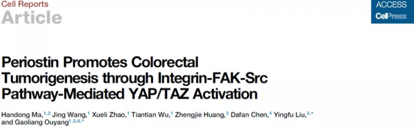 2020年1月21日,我室欧阳高亮教授课题组在Cell Reports期刊上发表了题为“Periostin Promotes Colorectal Tumorigenesis through Integrin-FAK-Src Pathway-Mediated YAP/TAZ Activation”的研究论文,揭示了细胞外基质蛋白Periostin在肠炎相关肠癌发生发展中的功能及其分子机制。