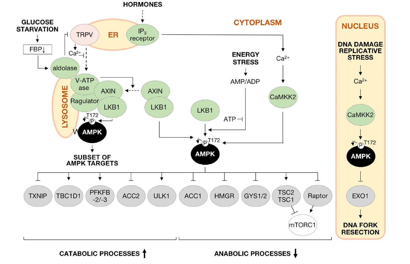 作者们首先从AMPK的调控入手,系统介绍了AMPK在不同物种中的保守性,并结合结构生物学的证据,详细阐述了其激活的分子机制。AMPK的α亚基含有激酶活力,其第172位苏氨酸(T172)的磷酸化修饰是激活的关键。这一磷酸化是由上游激酶LKB1所介导的。除了上游激酶,AMPK的另一个重要的调节分子是代表低能量的5’-AMP——这也是AMPK得名的缘由,AMP是两分子ADP在腺苷酸激酶作用下形成的产物,该反应还产生一分子ATP,因此在能量水平即ATP水平下降时,AMP水平上升。AMP能够结合AMPK的γ亚基,引起AMPK全酶,特别是α亚基上变构,从而促进T172位点的暴露使之更容易被LKB1所磷酸化。同时,AMP还能够保护T172磷酸化不被磷酸酶所去除,以及直接通过别构激活的方式数倍地提高AMPK的活力。上述的由LKB1和AMP所代表的“低能量”状态所介导的AMPK的激活过程被称为“经典(canonical)途径”。除外,AMPK还能被一系列非经典(non-canonical)途径所激活。例如,另一个上游激酶CaMKK2可以在钙离子浓度升高时直接磷酸化T172;β亚基可以结合如水杨酸这样的天然产物或者人工合成的激动剂引起AMPK的别构激活。