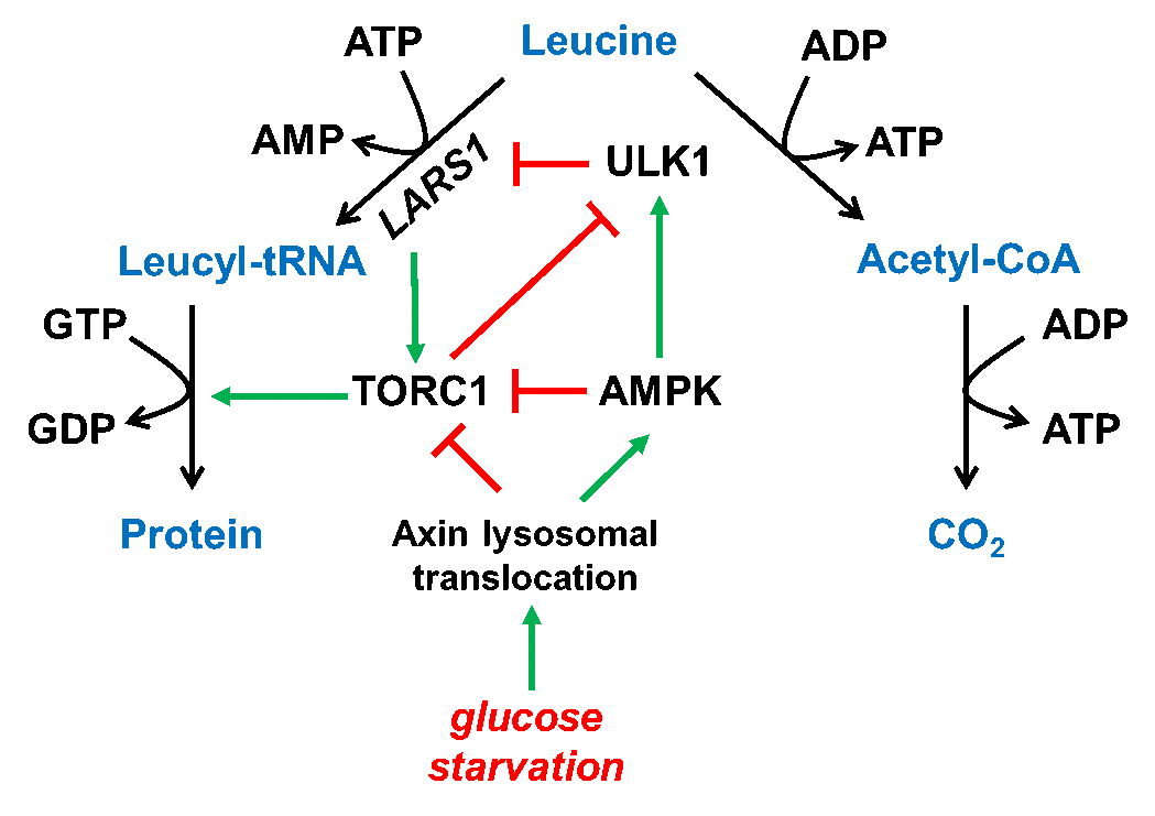 尽管它们是激活的条件恰好是相反的,AMPK和mTORC1这两种激酶复合体却能使用相同的分子v-ATPase和Ragulator,在溶酶体表面被激活,这种机制进一步地提供了对两种处在“对立面”上的感知器的精确调控。的确,正如林圣彩和张宸崧教授在今年二月在Cell Metabolism发表的Preview中列举的[6],葡萄糖饥饿本身可以在激活AMPK的同时通过另一些平行的途径抑制mTORC1的活力,从而通过多重的机制加以保证mTORC1被精确的调节:AXIN迁移到溶酶体膜上时,在激活AMPK的同时也能够改变Ragulator-RAG复合体,加速mTORC1从溶酶体上的解离以抑制其活力。新近还发现,AMPK能够通过激活下游的ULK1分子,再进一步磷酸化LARS1这一亮氨酰-tRNA合成酶,再通过调节RAG而促进mTORC1的解离(图4)。