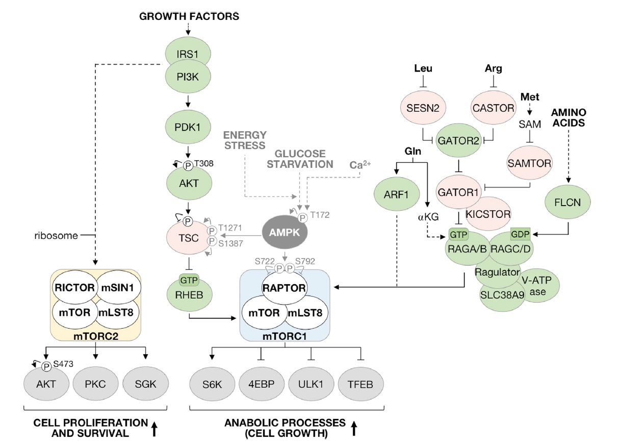 限于篇幅,作者们简要地阐述了AMPK如何通过磷酸化各式底物促进葡萄糖转运和分解代谢、促进脂肪酸氧化、抑制蛋白质合成、抑制脂肪酸合成、促进线粒体氧化磷酸化作用和促进自噬作用等方式,维持细胞的物质和能量平衡(关于AMPK的底物和功能的详细介绍,可参考文献[4])。而这其中,mTORC1是一个重要的AMPK底物和调控节点。