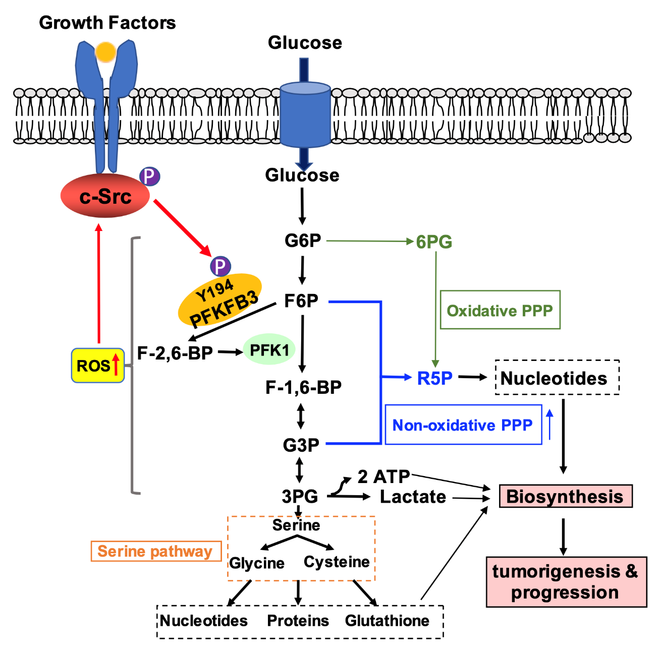 研究团队发现c-Src通过磷酸化PFKFB3 Tyr194位点激活其酶活性。由于PFKFB3能催化F6P生成F-2,6-BP, 而F-2,6-BP是糖酵解的关键酶PFK1的变构激活剂,因此,c-Src通过激活PFKFB3间接激活PFK1,从而使更多的G6P进入糖酵解,相对下调了氧化阶段的戊糖磷酸途径(Oxidative PPP)的流量。糖酵解流量的增强通过上调非氧化阶段的戊糖磷酸途径(Non-oxidative PPP)和丝氨酸从头合成途径促进肿瘤细胞的生物合成。敲除PFKFB3及敲除后回补PFKFB3-Y194F突变体均显著削弱肿瘤细胞的增殖、迁移和成瘤能力;PFKFB3-Y194F敲入小鼠显示糖酵解显著受损,将这些小鼠与APCmin/+小鼠杂交后产生的子代小鼠中,自发性结肠癌的生成能力显著下降;在临床肿瘤样品中PFKFB3-Tyr194的磷酸化水平与c-Src的活性高度相关。这些研究结果证明c-Src磷酸化PFKFB3 Tyr194在肿瘤发生发展中起重要作用。