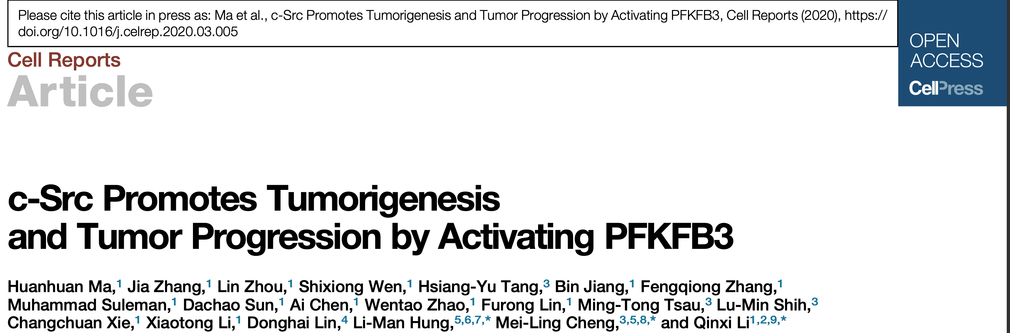李勤喜教授团队于2020年3月24日,在Cell Reports杂志发表题为 “c-Src Promotes Tumorigenesis and Tumor Progression by Activating PFKFB3” 的研究论文。该研究深入阐述了原癌基因SRC编码的非受体酪氨酸激酶c-Src在肿瘤葡萄糖代谢重编程中的功能及调控机制。