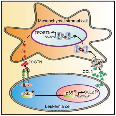在该项研究中,研究人员发现B-ALL骨髓组织中高表达的POSTN蛋白主要由BM-MSCs细胞分泌而来,且BM-MSCs细胞分泌的POSTN蛋白在体外可以促进B-ALL细胞的增殖和粘附;缺失POSTN的BM-MSCs细胞的促进B-ALL细胞皮下成瘤的能力明显下降。通过细胞因子芯片分析发现,CCL2的表达受BM-MSCs细胞分泌POSTN蛋白的调控。敲低B-ALL细胞中CCL2的表达可下调BM-MSCs细胞中POSTN的表达,并抑制B-ALL的发生。进一步研究发现,POSTN蛋白可通过Integrin-ILK-NF-κB通路促进B-ALL细胞中CCL2的表达分泌,而CCL2重组蛋白则可通过激活STAT3增加BM-MSCs细胞中POSTN蛋白的表达分泌。该研究表明,B-ALL细胞可通过CCL2-CCR2-STAT3信号通路促进BM-MSCs细胞表达POSTN,而BM-MSCs细胞来源的POSTN又可通过激活B-ALL细胞中Integrin-ILK-NF-κB-CCL2信号通路来促进B-ALL细胞的增殖与粘附,也就是说BM-MSCs细胞分泌的POSTN蛋白和B-ALL细胞分泌的CCL2蛋白可通过相互调节促进B-ALL的发生发展,该研究将为进一步阐明白血病肿瘤细胞与基质细胞之间的相互作用机制以及靶向BM-MSCs或者骨髓微环境来治疗白血病提供实验依据。