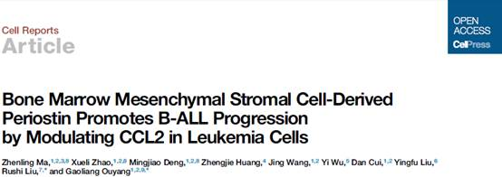 2月5日,欧阳高亮教授课题组在Cell Reports上发表了题为“Bone Marrow Mesenchymal Stromal Cell-Derived Periostin Promotes B-ALL Progression by Modulating CCL2 in Leukemia Cells”的研究论文,揭示了细胞外基质蛋白POSTN调控B-ALL发生发展的分子机制。