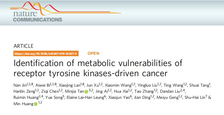 2019年6月20日,我室林树海教授课题组在《Nature Communications》上合作发表题为“Identification of metabolic vulnerabilities of receptor tyrosine kinases-driven cancer”的研究论文,报道了受体酪氨酸激酶驱动下的代谢偏向性和代谢抑制剂的个体化治疗效果。