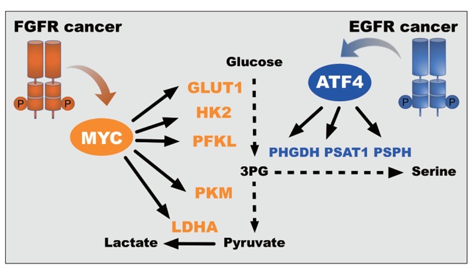 本研究以受体酪氨酸激酶为切入点,建立肿瘤代谢依赖性与临床现有的癌基因分子分型的关系,为代谢抑制剂敏感人群的遴选提供指导。重点以非小细胞肺癌重要的分子分型EGFR突变和FGFR扩增为例,发现了EGFR突变肿瘤高度依赖丝氨酸合成通路,而FGFR扩增指征肿瘤对乳酸合成的依赖,为丝氨酸合成和乳酸合成抑制剂的敏感群体选择指明了方向。