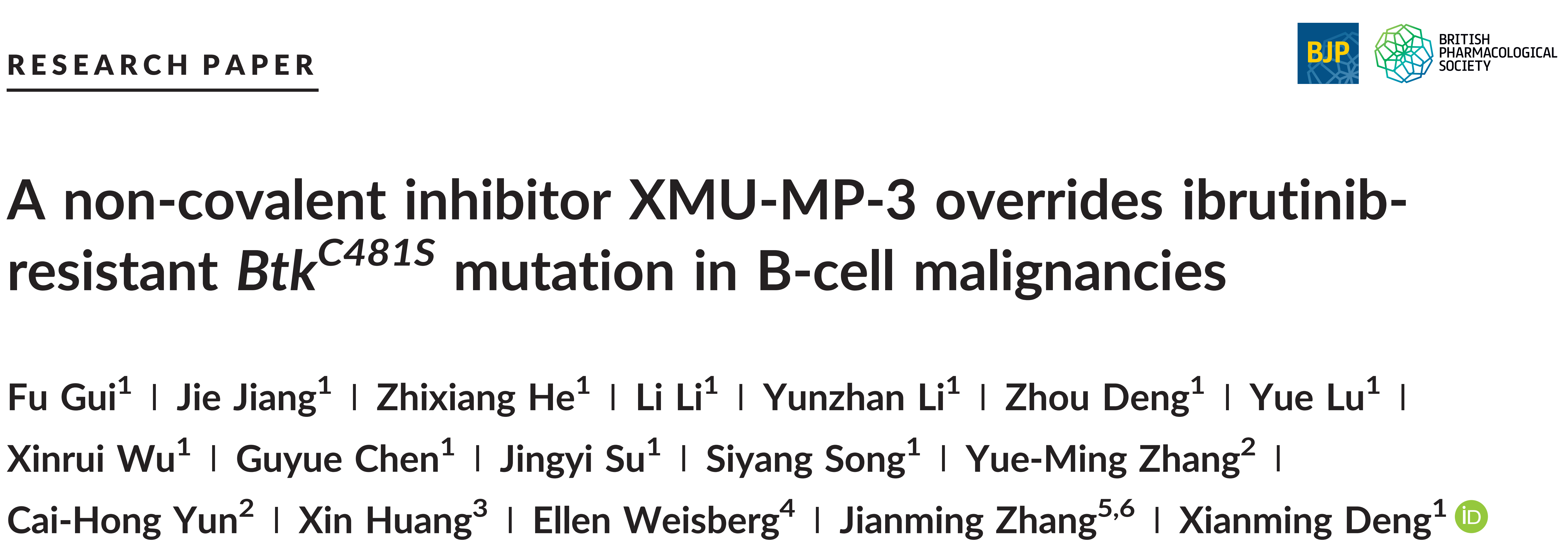 近日,我室邓贤明教授课题组在药学研究领域重要期刊《British Journal of Pharmacology》上发表题为“A non-covalent inhibitor XMU-MP-3 overrides ibrutinib-resistant Btk C481S mutation in B-cell malignancies”的研究论文,报道了克服BTKC481S耐药B细胞淋巴瘤的非可逆BTK新颖抑制剂。