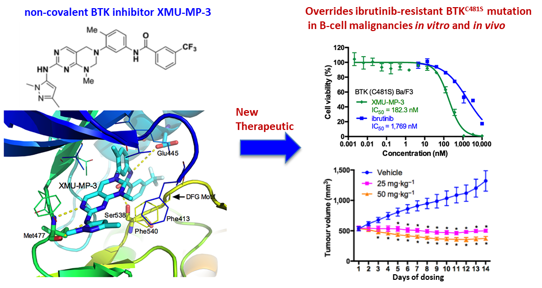 Bruton’s tyrosine kinase (BTK)在多种B细胞淋巴瘤的细胞生长和存活中具有重要作用,如慢性淋巴细胞白血病、套细胞淋巴瘤、弥漫性大B细胞淋巴瘤等。BTK的不可逆抑制剂,如ibrutinib,在B细胞淋巴瘤的临床治疗上展示出了非常好的疗效,但同时产生了不可避免的BTKC481S的耐药获得性突变。因此,开发能够克服临床BTKC481S耐药突变的新一代BTK抑制剂迫在眉睫。该研究团队构建了重组BTK及BTKC481S的“靶向细胞毒”筛选平台,在实验室自有的特色聚焦化合物库中筛选并优化获得了一个高效的BTK抑制剂XMU-MP-3。通过竞争性结合BTK的ATP结合口袋,XMU-MP-3抑制BTK的活性,进而抑制B细胞淋巴瘤的生长和存活。更重要的是,XMU-MP-3能够有效克服不可逆抑制剂产生的BTKC481S耐药点突变,在体外及小鼠移植瘤模型中均具有显著药效。该研究为BTK相关的B细胞淋巴瘤,尤其是临床上ibrutinib耐药的BTKC481S突变的B细胞淋巴瘤提供了有效的靶向治疗策略及先导化合物。