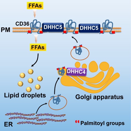 该研究发现了包括Dhhc4和Dhhc5在内的几个基因在脂肪组织中表达丰度较高,并且发现在脂肪酸吸收过程中发挥重要作用的CD36是DHHC4和DHHC5的底物。定位于高尔基体的DHHC4能够棕榈酰化修饰新生的CD36,并将其分选到细胞质膜上;而位于细胞质膜上的DHHC5则能阻止CD36的去棕榈酰化,从而维持其在细胞质膜的定位(下图)。无论是缺少DHHC4还是DHHC5,CD36都不能定位在细胞表面,从而丧失脂肪酸吸收的活性。