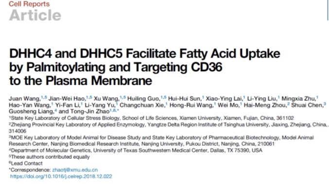 1月2日,我室赵同金教授课题组在Cell reports上发表了题为DHHC4 and DHHC5 Facilitate Fatty Acid Uptake by Palmitoylating and Targeting CD36 to the Plasma Membrane的研究论文,揭示了两个蛋白质棕榈酰化转移酶DHHC4和DHHC5通过对CD36的棕榈酰化修饰调控细胞的脂肪酸吸收过程。