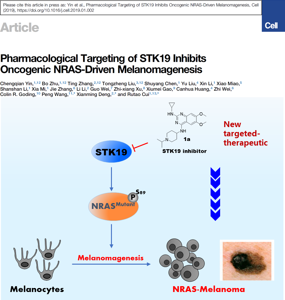 2019年1月31日,细胞应激生物学国家重点实验室、天然产物源靶向药物国家地方联合工程实验室、厦门大学生命科学学院邓贤明教授课题组在顶级期刊《Cell》上合作发表题为“Pharmacological targeting of STK19 inhibits oncogenic NRAS driven melanomagenesis”的研究论文,首次报道了靶向新颖激酶STK19的小分子抑制剂可有效抑制NRAS介导的黑色素瘤的发生和发展,可望发展成为NRAS介导黑色素瘤的靶向药物。