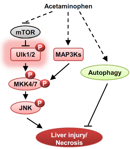 对乙酰氨基酚是一种广泛使用于药物中的具有止痛和退热功能的成分。世界上每天都有大量患者因过量使用对乙酰氨基酚而造成肝脏损伤,已取代病毒性肝炎成为造成急性肝衰竭的最常见原因。另一方面,ULK1/2是细胞自噬启动过程中的核心激酶,然而,其生理和病理功能尚不清楚。