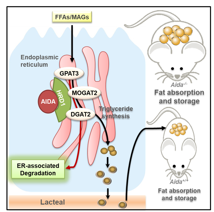 膳食脂肪进入体内后,首先在小肠里水解成脂肪酸和单酰甘油,被小肠上皮细胞摄入,在小肠上皮细胞中又重新合成脂肪,形成脂蛋白并从小肠上皮细胞分泌,而进入淋巴循环并通过血管输送到全身被各个器官利用或储存。而AIDA缺失小鼠中增高的脂肪吸收效率就来源于肠道中脂肪合成途径的数个合成酶的蛋白质水平的上调,促进脂肪酸重酯化减少细胞内的脂肪酸的含量,增加进一步从小肠里吸收脂肪酸。脂肪合成途径的代谢酶大多都定位于内质网。该团队通过机制的研究发现,AIDA缺失导致一种原先认为只调控内质网里的蛋白质质量和数量的途径——内质网降解途径(ERAD)无法降解这些脂肪合成酶,导致其蛋白水平上升。内质网降解途径的抑制剂处理的野生型小鼠的餐后血脂会上升到跟未处理的Aida敲除小鼠相同的水平,而该抑制剂对Aida敲除小鼠则没有作用,这表明Aida敲除和ERAD失效对于餐后血脂有完全一致的效果。在肠道特异性敲除Aida的小鼠中,肠细胞脂肪吸收的速率和血液中脂肪含量的上升速率等表型跟上述全身敲除小鼠非常类似,也表明了肠道中的AIDA在脂肪吸收效率的调控上至关重要。