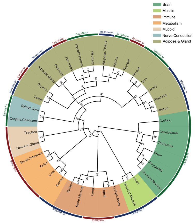 在这项研究中,纪志梁教授课题组建立了一个计算分析思路,尝试去阐述基因在构建器官功能联系之间的作用。为此,他们从8个囊括了36个人类正常组织的转录组数据集中,挖掘出一致性的模式基因集(包括看家基因和选择性/特异性表达基因),随后通过分析这些模式基因在器官功能的潜在角色,尝试从基因功能的角度阐述什么主导着器官功能,什么在介导器官之间的功能联系,以及不同器官是怎样协作以完成特定的机体生理学功能。最重要的是,纪志梁教授课题组发现选择性基因可以稳定地表征器官之间的功能联系,暗示选择性基因或在器官功能对话之中扮演重要角色,因此,基于36个人体正常器官/组织,他们构建了一个器官功能联系图,展示了器官之间的功能联系。模式基因在探索器官功能的分子机制上起到了或起关键作用,同时也暗示它们可作为选择性生物标志物和治疗靶点。
