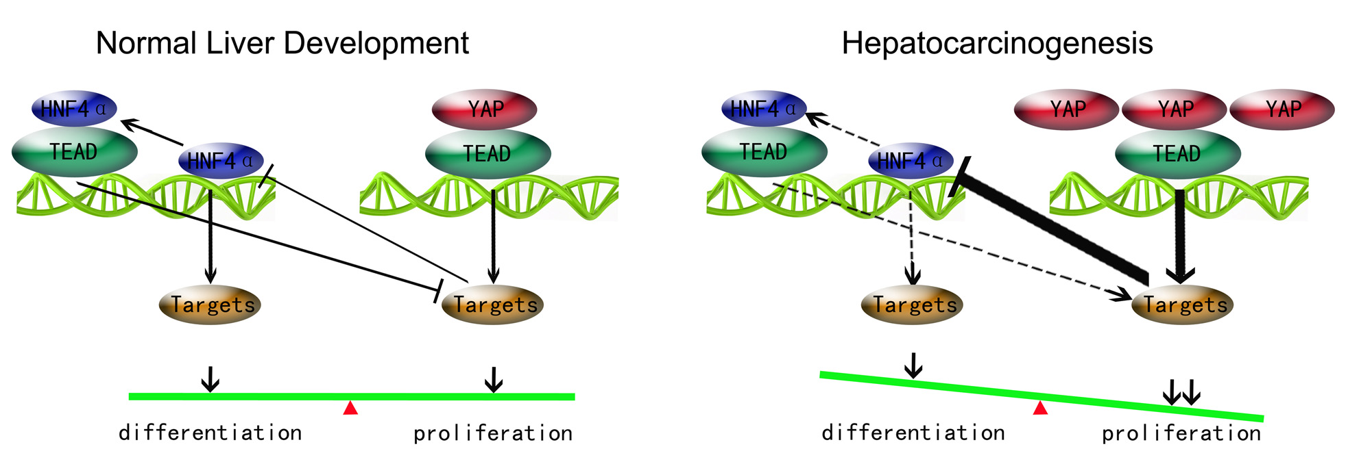 YAP和HNF4α是促进肝细胞增殖/癌变与分化的两个最重要因子,然而两者之间的关系一直不明确。李博安教授以及课题组成员蔡望宇、林凌云以及郝翰等经过研究发现,YAP1可以通过泛素化-蛋白酶体途径降解HNF4α,从而抑制HNF4α下游靶基因的表达;反过来HNF4α则通过与TEAD4竞争结合YAP1 而抑制YAP-TEAD的转录活性和下游靶基因的表达。重要的是,过表达HNF4α能够完全抑制YAP-TEAD诱导的肝癌细胞的增殖与干细胞扩张。这样,在YAP-TEAD信号与HNF4α之间形成一个双负反馈环,共同维持肝细胞增殖-分化平衡,而打破这种平衡会引起癌变。最后,他们还在大鼠诱导肝癌模型和转基因/基因敲除小鼠肝癌模型中验证了这一假说。