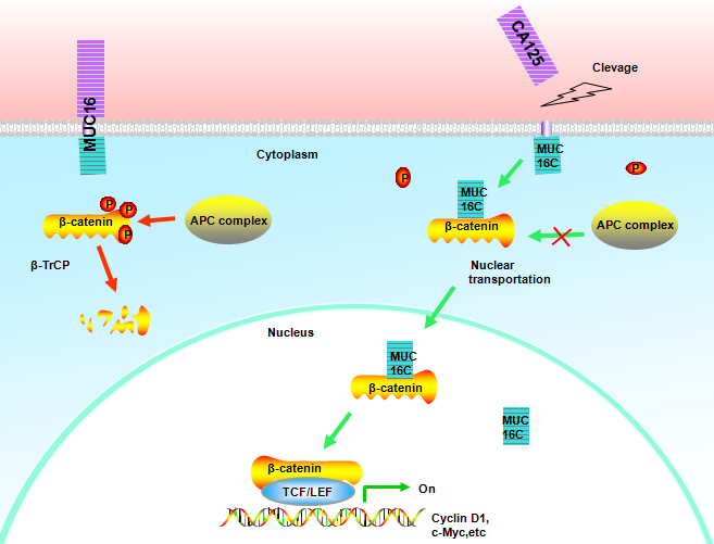 课题组通过制备可识别MUC16C端的单抗,首次显示细胞内源的MUC16可与β-catenin相互作用并鉴定出它们的相互作用位点。另外,MUC16 C端的过表达可稳定β-catenin蛋白并促其入核从而激活Wnt信号通路;而敲低MUC16则显著降低了高表达MUC16细胞的生长和迁移能力。该研究结果表明MUC16可能是一个非常诱人的抗肿瘤抗体药物靶点。