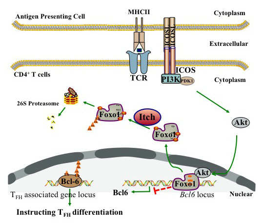 Bcl-6 is an essential transcription factor that instructs the program of TFH differentiation.Inducible Costimulator (ICOS)also plays a critical role in this process, by inducing the expression of Bcl-6 through PI3K-Akt signaling pathway. Our study demonstrated that transcription factor Foxo1 inhibits TFH differentiation,bysuppressing Bcl-6 expression. ICOS-PI3K-Akt signaling leads to the phosphorylation of Foxo1, which is subsequently targeted for ubiquitination and degradation by E3 ubiquitin ligase Itch. Itch-deficient CD4+ T cells fail to degrade Foxo1 upon ICOS-PI3K-Akt signaling, and therefore, exhibit impaired Bcl-6 induction and TFH differentiation. Hence, our study revealed the important roles of Itch and Foxo1 in TFH differentiation. In the future, we will focus on the molecular mechanisms underlying Bcl-6 induction and regulation by upstream signaling pathways, including cell-cell contact and cell metabolism. We will investigate functions of candidate genesin the immune system, especially in TFH differentiation, by utilizinggenetically modified mice and immune disease models (such as bacterial and viral infections). For genes with important functions, we will elucidate their cellular and molecular mechanisms of action by employing multiple experimental approaches.