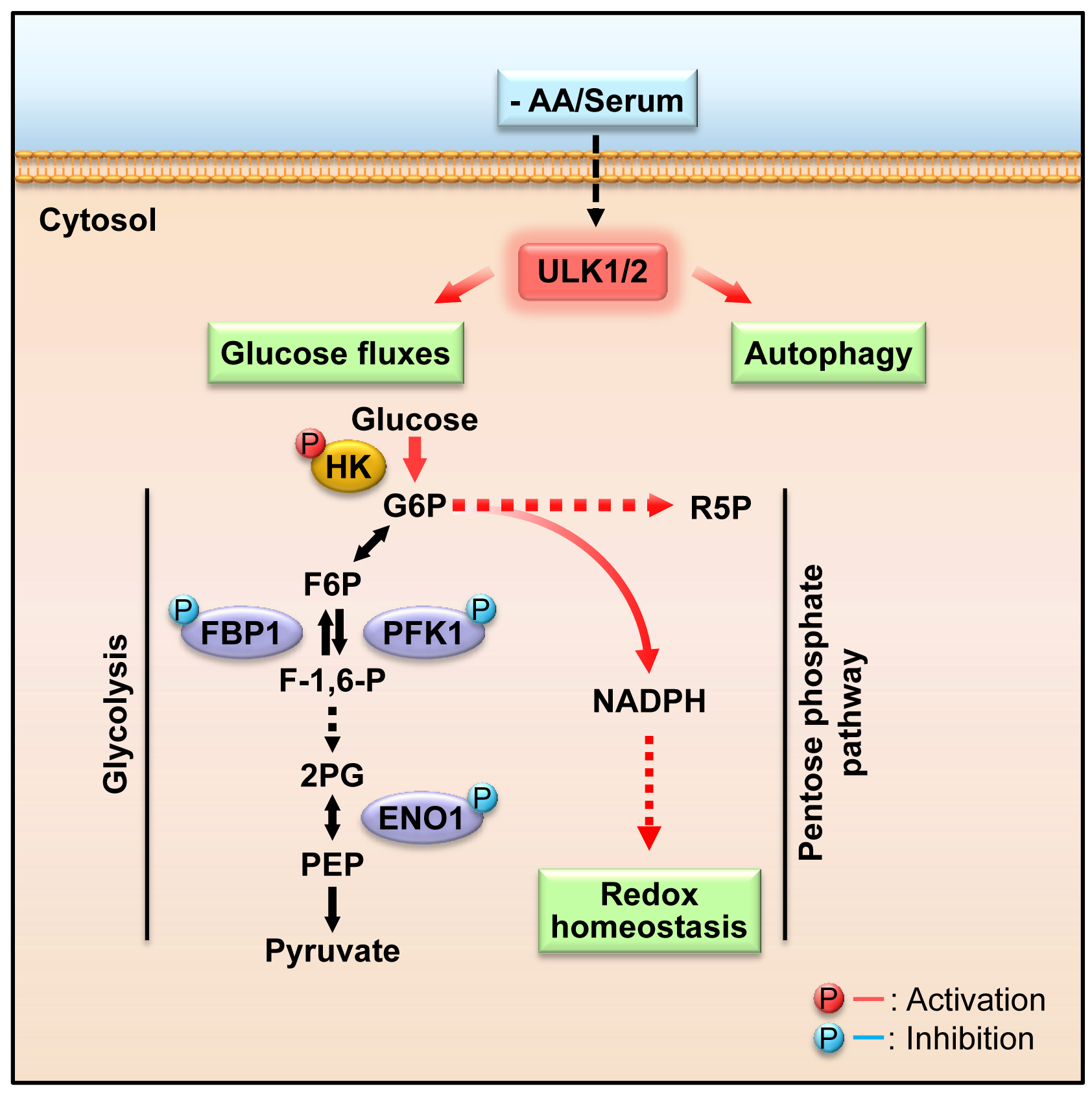 Abstract: Metabolic reprogramming is fundamental to biological homeostasis, enabling cells to adjust metabolic routes after sensing altered availability of fuels and growth factors. ULK1 and ULK2 represent key integrators that relay metabolic stress signals to the autophagy machinery. Here, we demonstrate that, during deprivation of amino acid and growth factors, ULK1/2 directly phosphorylate key glycolytic enzymes including hexokinase (HK), phosphofructokinase 1 (PFK1), enolase 1 (ENO1), and the gluconeogenic enzyme fructose-1,6-bisphosphatase (FBP1). Phosphorylation of these enzymes leads to enhanced HK activity to sustain glucose uptake but reduced activity of FBP1 to block the gluconeogenic route and reduced activity of PFK1 and ENO1 to moderate drop of glucose-6-phosphate and to repartition more carbon flux to pentose phosphate pathway (PPP), maintaining cellular energy and redox homeostasis at cellular and organismal levels. These results identify ULK1/2 as a bifurcate-signaling node that sustains glucose metabolic fluxes besides initiation of autophagy in response to nutritional deprivation.